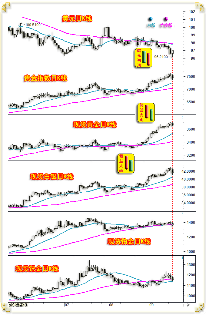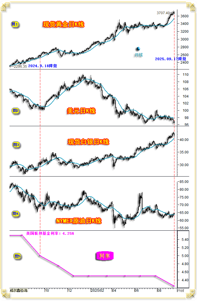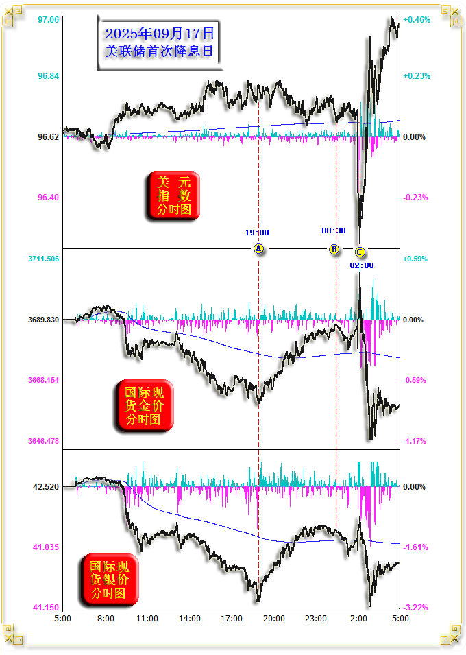 伴随网络文化合规性的不断发展,个人公众号功能受限越来越多。至今日起,公司将正式重启一直保留着的原公司公众号,将其作为“威尔鑫点金”等文章首发的公众号。由于原公众号关注人数超限,不能将个人公众号信息直接完全进行迁移,故只能麻烦朋友们重新手动添加对公司公众号的关注。公司公众号名称:威尔鑫wellxin 账号:wellxin-cd 个人公众号名称:杨易君黄金与金融投资 账号:yangyijun1616将作为备用号继续保留 为此给您带来不便,敬请谅解! 2025年9月16日 周三 美联储一如市场预期,再次推开美元降息周期之窗,市场波动剧烈,幻象丛生! 国际现货金价以3690.60美元开盘,最高上试3707.40美元,最低下探3645.85美元,报收3659.55美元,下跌30.28美元,跌幅0.82%,振幅1.67%,日K线呈续创历史新高后大幅回落的中阴线。 ![]() 美元指数以96.63点开盘,最高上试97.06点,最低下探96.21点,报收97.00点,上涨380点,涨幅0.40%,振幅0.88%,日K线呈创近年新低之后收高的中阳线。 Wellxin贵金指数(金银钯铂)以7558.69点开盘,最高上试7594.26点,最低下探7377.33点,报收7442.57点,下跌115.64点,跌幅1.53%,振幅2.87%,日K线呈震荡下行长阴线。 国际现货银价下跌2.09%,报收41.63美元;铂金价格下跌2.02%,报收1364.20美元;钯金价格下跌2.19%,报收1152.50美元。 周三隔夜,美联储如期宣布降息25点,自去年12月18日降息之后,再次推开降息周期之窗。但贵金属、商品市场好似“利好兑现见利空”而全线下跌,贵金属之银钯铂价格跌幅超2%,彰显相应市场抛压强劲。金价在美联储宣布降息之后,曾快速激扬续创历史新高,然就收盘观察,好似一个利用“利好信息”兑现时的完美诱多! 日K线形态观察,虽周三美元指数再创数年新低,但终盘光头阳线报收,似阶段乃至中期见底的“曙光初现”。贵金指数,尤其金银价格K线形态,则似阶段乃至中期见顶的“倾盆大雨”,与周一二金银、贵金指数相较于美元下跌而滞涨的信息相符,后市浓雾骤起! 就金银、美元盘面信息观察: ![]() 北京时间19点(A位置)前的亚欧盘面,金银市场即体现出相较于美元市场指引的强劲抛压。尤其银价,最大动态跌幅高达3%。 19点至隔夜凌晨零点30分,图示AB区间,美元横向回软,金银价格强劲回升,这段市场信息体现出美盘抄底意愿强化。 隔夜凌晨2点(C位置),美联储如期宣布降息25点后,美元闪崩创出近年新低,金价激扬续创历史新高。银价亦对应走强。金价虽再创历史新高,但涨幅弱于美元下跌对应的关联指引,银价表现更弱。如果此时超短线投资者根据盘感入场顺势做多金银,终盘就会惊出一身冷汗!美元竟光头阳线报收,金银价格则风云突变收于日内低位。 为何凌晨两点之后金银、美元盘面如此“诡异”,是受美联储会后申明影响吗?我认为不是,这是一个单纯市场心理、情绪造成的“物极必反”式技术反应。回顾周三美联储宣布降息之后的鲍威尔讲话,内容平常,符合预期。关于鲍威尔讲话内容,投资者看点应聚焦于“就业”与“通胀”信息。 通胀信息方面,鲍威尔表示,近期通胀有所上升,且仍处于历史相对高位。商品价格上涨是今年通胀上升的主要原因,关税对通胀的总体影响仍有待观察。 结合商品市场表现思考鲍威尔此段讲话的含义:就基本金属、原油市场表现来看,最近一年(2024年9月至今)几无涨跌,油价还出现了一定跌幅,故实际上最近一年商品市场并没为美国通胀上行拱火。鲍威尔将“近期通胀上升”归咎为商品价格上涨,算是给了特朗普面子,“关税对通胀的总体影响待观察”表达方式,同样如此。另一层面信息为,美国肯定不希望后期商品市场上行为通胀加速助力。当然,能否在后期美联储继续降息的背景下,抑制商品市场上涨,那得看美国调控者的艺术与华尔街的能力了。 就业市场信息方面,鲍威尔表示劳动力市场面临下行风险,且并非全由移民因素导致,而是需求明显放缓。这段话说明了鲍威尔对美国经济前景有“系统性担忧”,目前属于“预防式”降息,故降息不会太激进。 针对此次降息,高盛认为,如果联邦公开市场委员会多数成员的目标是今年再降息两次,这表明委员会中的‘鸽派’已掌握主导权。高盛认为,除非通胀出现大幅意外上升或劳动力市场显著反弹,否则美联储不会偏离当前的宽松政策轨道。 惠誉认为,如今美联储全力支持劳动力市场,明确释放出2025年将进入一个果断而激进的降息周期。信息非常清晰:增长和就业是首要任务,即便这意味着在短期内会容忍更高的通胀。 此观点与笔者今年1月1日在年度报告中,对美国经济运行趋势的分析预期相符。 据最新CME“美联储观察”:美联储10月降息25个基点的概率为87.7%。 周三金银市场大幅下跌,乃技术叠加消息面共振的结果。诚如笔者近期有关银价的技术分析呈现,银价在42美元附近存在多点共振压力,进而旁证不宜盲目追涨黄金。如截止周二收盘的国际现货银价动态月K线图示: ![]() 如图所示,1)图示H2轨道线;2)49.77美元至11.62美元十年大熊市回升的80.9%黄金分割线,42.48美元;3)以2020年熊市大底11.62美元为切点的361.8%黄金分割位,42.03美元;4)以2020年11.62至29.86美元为新周期牛市源生浪向上161.8%黄金分割切线位,41.44美元,皆在当前构成银价上行阻力。且L4趋势线被一气呵成突破后,也对银价有回吸引力。 此外,近日国内黄金市场的强劲抛压亦可见端倪,如国际现货金价日K线,上海两大交易所金价相较于理论人民