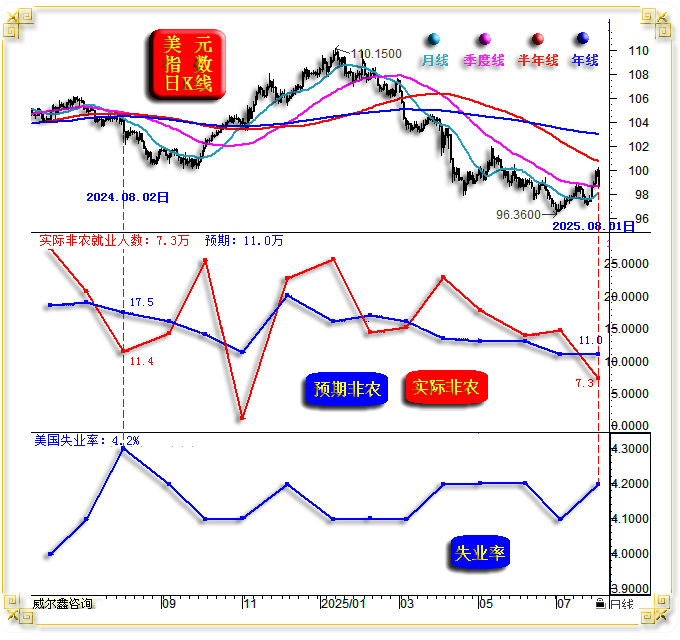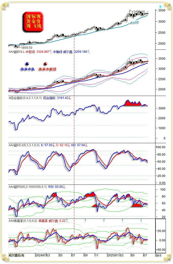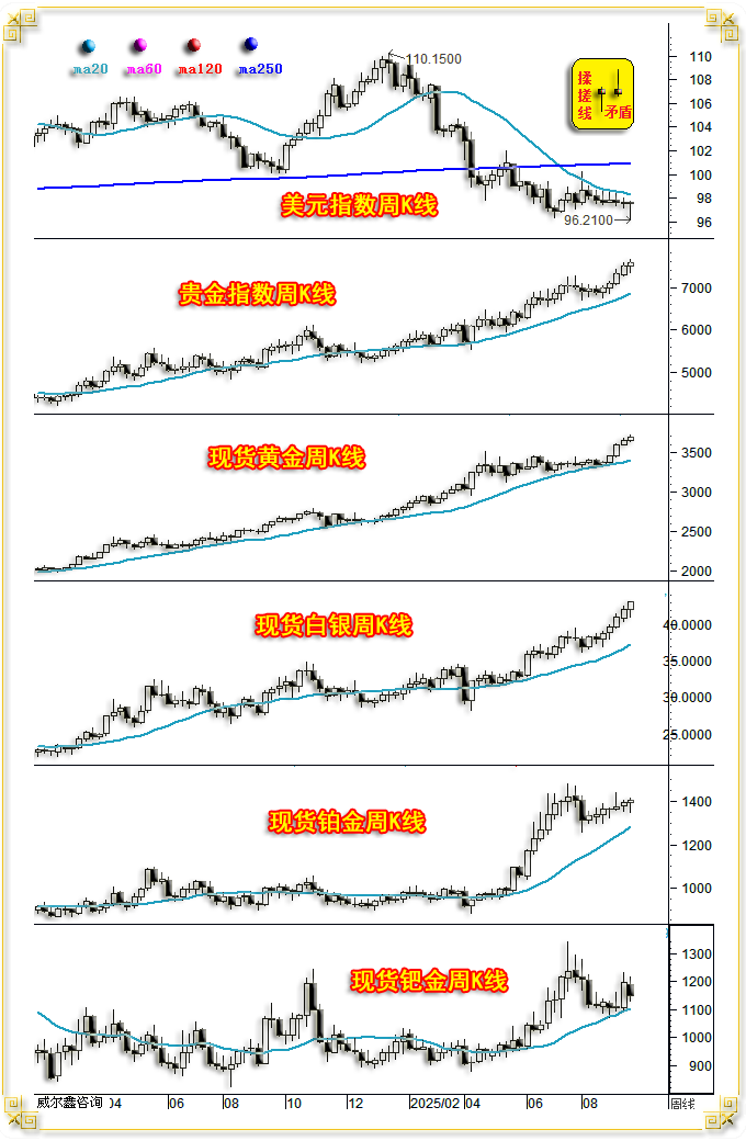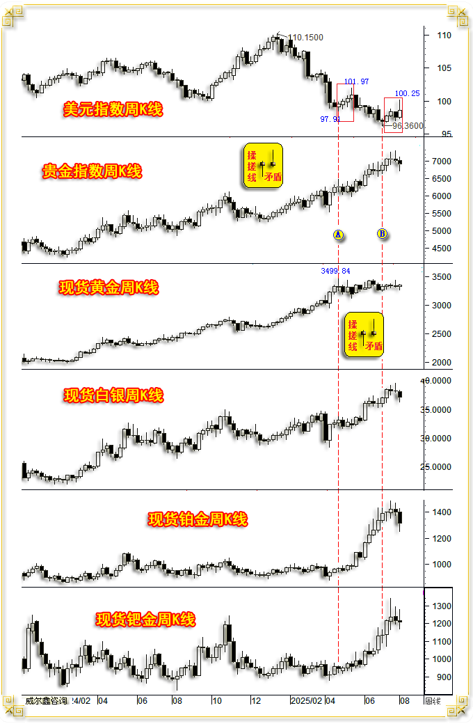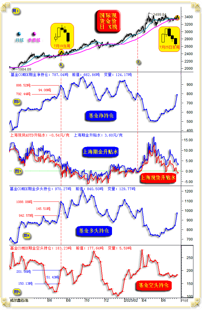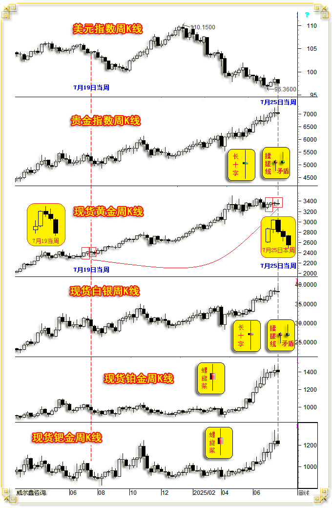 上周 国际现货金价以3642.99美元开盘,最高上试3707.40美元,最低下探3626.29美元,报收3684.36美元,上涨41.67美元,涨幅1.14%,振幅2.23%,周K线震荡上行小阳线,续创历史新高。 ![]() 美元指数以97.59点开盘,最高上试97.80点,最低下探96.21点,报收97.64点,上涨40点,涨幅0.04%,振幅1.63%,周K线呈先抑后扬T字阳,一度创出近年新低。 wellxin贵金指数(金银钯铂)以7502.56点开盘,最高上试7645.01点,最低下探7356.79点,报收7573.23点,上涨66.83点,涨幅0.89%,振幅3.84%,周K线呈震荡上行小阳线,续创历史新高。 现货银价上涨2.17%,振幅4.72%,报收43.07美元,续创14年新高。 现货铂金价格上涨1.04%,振幅4.49%,报收1406.15美元; 现货钯金价格下跌3.98%,振幅6.88%,报收1149.50美元; ![]() NYMEX原油价格下跌0.38%,振幅4.09%,报收62.36美元; 伦铜下跌0.68%,振幅2.74%,报收9996.50美元; 伦铝下跌0.93%,振幅2.00%,报收2676.00美元; 伦铅下跌0.79%,振幅1.31%,报收2003.00美元; 伦锌下跌1.95%,振幅4.25%,报收2898.50美元; 伦镍下跌0.72%,振幅2.18%,报收15270.00美元; 伦锡下跌2.10%,振幅3.88%,报收34220.00美元; 道琼斯指数上涨0.37%,振幅0.63%,报收46315.27点; 纳斯达克指数上涨0.72%,振幅0.66%,报收22631.48点; 标准普尔上涨0.49%,振幅0.63%,报收6664.36点; 标普500席勒市盈率进一步上行至39.95倍,持续于140年美股系统性估值绝对峰巅。 上周美联储时隔一年之后再次宣布降息,各市场市场板块运行特别: 美元指数先抑后扬,降息利空落地之后似见利好,尽收此前周内再创近年新低时的巨大跌幅。周K线形态观察,系列长上影、长下影小阴阳“纠结揉搓”之后,目前长下影定格,K线组合形态表象看涨,意味美元存在阶段,乃至中期见底可能。然进一步结合趋势观察,又当小心评估。阶段而言,首先需要有效攻克20周均线的趋势反压,然后是250周均线的更强反压。 贵金属中,除了钯金表现矜持以外,其余皆涨,似受美元指数转强的影响不大。尤其近期独秀的金银市场,再现强势,续创大周期新高。 原油与基本金属全线下跌,且整体跌幅超过了美元指数转强对应的金融关联指引。笔者早先预期原油、基本金属等大宗商品市场应该是“不见兔子不撒鹰”,等美联储确实宣布降息之后,才会全面转强。然就上周大宗商品市场表现观察,这个逻辑尚未出现兑现迹象。相反,商品市场似乎担心美元指数阶段或中期见底,进而呈现出跌幅超出美元指数指引的状况。尽管上周贵金属表现强劲,但若基本金属、原油等大宗商品不转强以“通胀预期上行”的方式进行助攻,金银等贵金属中期牛市周期的持续性会受到考验,市场前景需更多信息去综合论证、评估。 美股竟然无视美元先抑后扬而继续走强,这倒是美国调控层乐见的状况。商品市场下行为通胀减压,美股延续强势稳金融的同时,提振市场对美国经济前景的信心,这是美国调控层乐见的市场运行状况。 今年贵金属市场牛气冲天!截止上周市场收盘,国际现货金价年内涨幅已高达40.42%,银价年内涨幅为49.15%,铂金价格年内涨幅为55.58%,钯金价年内涨幅为26.25%。有多少投资者搭上了金银牛市的高铁?!那些一直关注着金银市场,尤其错过了去年大牛市的投资者,今年有智勇上车了吗?去年错过,可理解为运气不佳。今年继续错过,甚至反向操作,那定是能力问题了!去年国际现货金价收盘于2623.81美元,然笔者在今年1月1日年度报告中多角度立体论证展望:“3000美元只是黄金牛市小目标,今年实现一点不困难。大周期而言,金价5000美元合理,10000美元也并非不可能。” 如果投资者当时只是听到笔者这个观点,第一印象肯定认为笔者是个想讲故事,说大话博眼球的疯子。但投资者若仔细阅读理解那篇文字超过两万字的各视角立体式论证报告,应该趋于相信了,或只是觉得“太不可思议”!最近几期文章,笔者从不同角度展示了五月以来给客沪的内.部报告,论证为何不仅不能战略做空黄金,且仍需逢低继续做多。大餐总是最后上桌,本期内.部报告分享,笔者原本希望像前几篇文章一样,选取核心内容公布,以节省篇幅,岂知竟然不好删减,故决定原原本本地呈现。本期内部报告分享的论证内容为:今年3至7月的黄金市场,就时间周期、基本面、技术面、国内与国际金市资金流向、对冲基金行为特征,以及金价相较于金融关联环境的表现形式等多维度观察,都在高度复刻去年同期的3至7月。后市不难进一步推导,金价一定会选择向上突破,掀起新一轮中期牛市。下面原文呈现(对文章理解有难度或不便的投资者,可以观看本期视频版): ![]() a 7月26日内参: 金市技术恶化无碍中期看涨 时间周期-金价形态-国际对冲基金-国内金市行为完全重演,金银技术恶化无碍中期看涨 2025年7月26日 威尔鑫投资咨询研究中心首席分析师杨易君 本周国际现货金价以3348.12美元开盘,最高上试3438.54美元,最低下探3324.84美元,报收3336.99美元,下跌12.43美元,跌幅0.37%,振幅3.39%,周K线呈先扬后抑,冲高回落倒T字阴,有“射击之星”阶段或中期见顶意蕴。 ![]() 本周美元指数以98.44点开盘,最高上试98.50点,最低下探97.10点,报收97.67点,下跌770点,跌幅0.78%,振幅1.42%,周K线呈震荡下跌中阴线。 本周wellxin贵金指数(金银钯铂)以7043.69点开盘,最高上试7275.83点,最低下探6953.20点,报收7006.55点,下跌39.66点,跌幅0.56%,振幅4.58%,周K线呈先扬后抑,上影更长的十字阴。 本周: 现货银价下跌0.08%,振幅4.17%,报收38.38美元; 现货铂金价格下跌1.31%,振幅6.66%,报收1399.