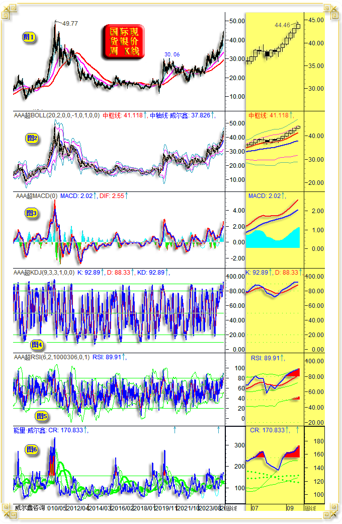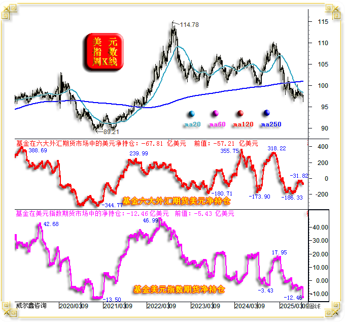 上周对冲基金在六大外汇期货市场,美元指数期货市场加码做空,强化了本周金银价格惯性上涨的指引力度。如美元指数周K线及基金外汇期货、美元指数期货市场中的净持仓信息图示: