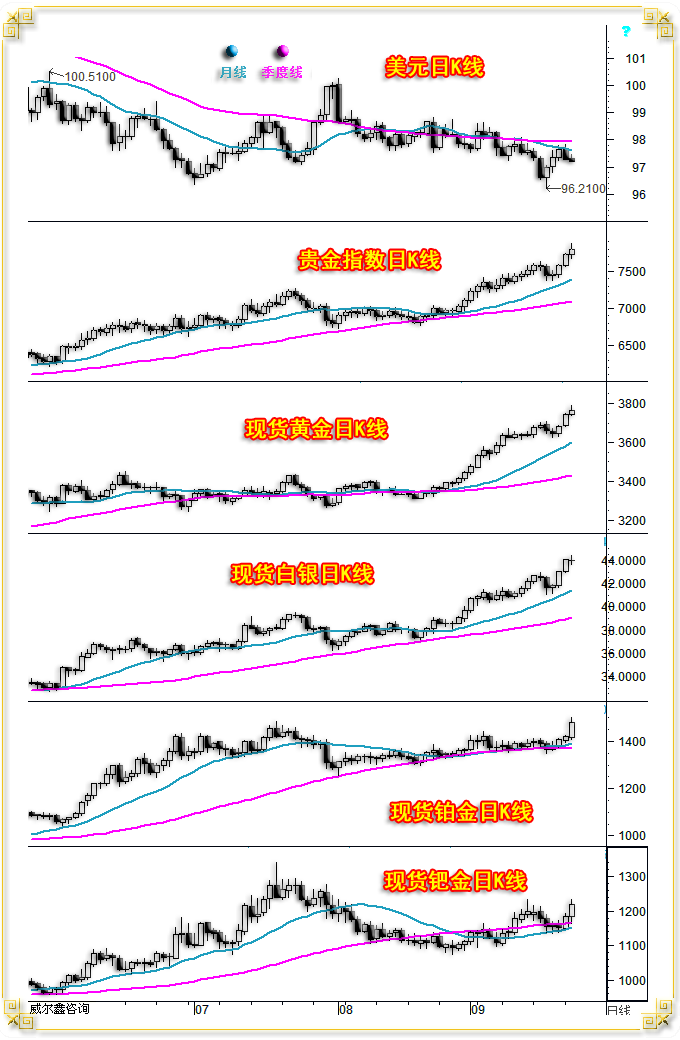 美元指数以97.30点开盘,最高上试97.45点,最低下探97.19点,报收97.21点,下跌70点,跌幅0.08%,振幅0.27%,日K线呈震荡回软小阴线。 Wellxin贵金指数(金银钯铂)以7717.12点开盘,最高上试7866.17点,最低下探7664.41点,报收7790.15点,上涨71.19点,涨幅0.92%,振幅2.61%,日K线呈震荡上行小阳线,续创历史新高。 国际现货银价下跌0.16%,报收43.98美元;铂金价格上涨4.21%,报收1478.36美元;钯金价格上涨2.97%,报收1216.81美元。 周二在美元指数震荡回软过程中,贵金属市场表现强劲,但轮动运行特征明显。此前表现强劲的金银市场出现上行疲态,钯铂价格则开始加速补涨。伦敦LME基本金属市场继续疲软,商品市场尚未出现整体转强迹象。 美元指数连续三日反弹之后,再遇阻月线、季度线共振阻力而回落,略上位置还有20周均线反压,美元技术表象依然趋空。 观金银、美元盘面信息: