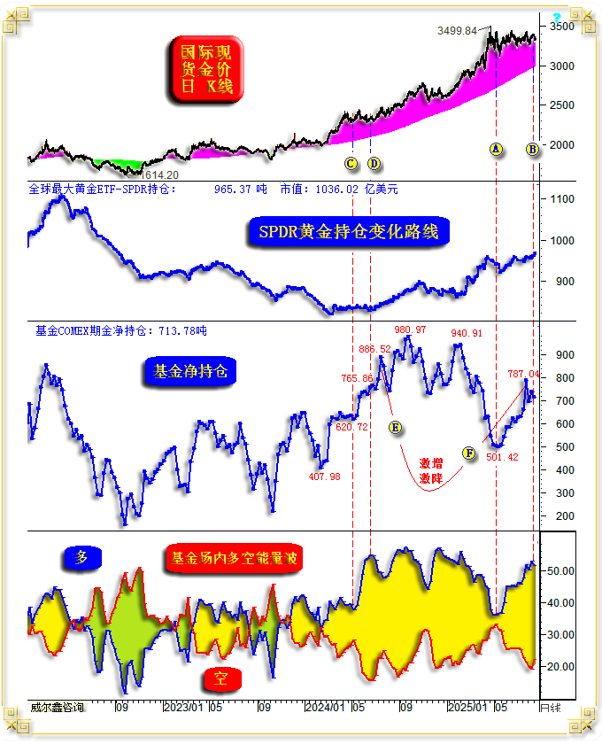 虽然这是一幅去年的黄金市场场内外能量分布图,但足以解释黄金场内外的能量分布特征。观2024年6月全球黄金市场交易信息,交易总量指数(流动性)日均值为195.84点(即1958.4亿美元),其中以纽约商品交易所、上海期货、现货交易所为代表的场内交易占64.61点(646.1亿美元),黄金ETF占2.15点(21.5亿美元)。而看不清多空方向的场外交易高达129.09点(1290.9亿美元),几乎是场内交易量的二倍。故即便有一定道行的专业人士,若只盯着场内交易数据进行分析,也可能在某个市场阶段掉进陷阱。20年来,威尔鑫不断搭建、完善我们所需要的数据库与分析模型。 就我们的信息系统观察,虽然本周对冲基金在黄金、白银、原油期货市场抛压较强,在美元外汇期货市场买盘较强。但在黄金、白银、原油场外现货市场买盘很强,强度超过了基金在场内的抛压。外汇市场同样,现汇市场美元卖盘远远超过了基金场内对美元的买盘力度。这些综合信息显示,后期金银价格看涨,美元必将继续下跌! 关于对冲基金在金银市场中的操作,尤其在黄金市场中的操作,虽然本周基金看似在割肉引导投资者看空。但实际上,对冲基金在去年金价创出历史新高后的“高位诱空”大戏,再次重演,且力度更大。如国际现货金价日K线,全球最大的黄金ETF持仓信息,基金COMEX期金市场净持仓,黄金场内多空能量波信息图示: