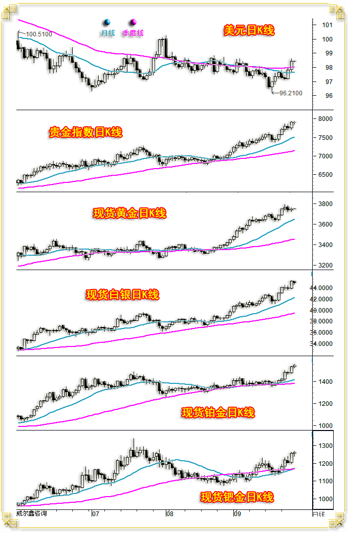 周四 国际现货金价以3736.17美元开盘,最高上试3761.38美元,最低下探3721.65美元,报收3748.13美元,上涨12.06美元,涨幅0.32%,振幅1.06%,日K线呈震荡上行小阳线。 ![]() 美元指数以97.85点开盘,最高上试98.60点,最低下探97.72点,报收98.44点,上涨600点,涨幅0.61%,振幅0.89%,日K线呈震荡上行中长阳线。 Wellxin贵金指数(金银钯铂)以7748.33点开盘,最高上试7926.86点,最低下探7718.36点,报收7903.83点,上涨155.22点,涨幅2.00%,振幅2.79%,日K线呈震荡上行长阳线,续创历史新高。 国际现货银价上涨2.89%,报收45.16美元;铂金价格上涨3.75%,报收1530.45美元;钯金价格上涨4.19%,报收1254.95美元。 尽管周四美元表现强劲,但贵金属不惧美元强势,全面走强。银钯铂价格以周期强势金价为锚,大幅补涨。 K线形态趋势观察,美元虽向上突破了月线、季度线共振反压,存在阶段或中期走强可能,但突破幅度、时间,尚不足以说明突破的有效性。尤其考虑到周四美元的上行动力,很大程度来源于超市场预期的二季度GDP终值利好数据提振,非市场自然运行选择: ![]() 数据显示,美国二季度GDP年化季率终值为3.8%,远超市场预期持平于第一次调整后的3.3%。数据公布后,美元跳涨,金银盘面承压。 自上周下探96.21点后,近日美元强劲回升,但中期下行趋势尚未出现改观。目前美元短期强势与中期弱势信号冲突。而金银等整个贵金属板块,阶段与中期趋势皆共振向上,周四不惧美元强势,呈现超强市场内蕴。 诚如笔者上篇文章所言,当前金银市场行情让踏空者、做空被套者非常难受,好似失去了原本清晰的操作参考之锚。近日美元指数上涨已超2000点,反弹势头强劲,理论上当遏制金银价格上涨,给做空被套者以止损出局的机会,或给空仓看多者以从容入场的机会。然实际情况并非如此,近期金银钯铂价格皆无视美元强势,续创新高。空仓观望者看不到上车之锚,见金银价格绝尘而去,心里只有干着急;空仓被套者侥幸等待或期望:金银价格该对美元强势有反应了吧?!但越等越失望,越等越绝望!目前好似:被套者若不小损转多杀空,多头主力就会利用天时继续让你放大亏损,逼你最终以更大的亏损就范。对身处上涨趋势高铁的多头而言,对后期金银价格继续上涨有绝对把握吗?就我们而言,当然不敢绝对!只是若倾向金银价格继续上涨概率大,且刚好多头持仓极具成本优势,就有了继续博取放大利润的心理优势。这就是在早期布局时,为何要多维度分析论证的原因。一旦发现市场出现多维度共振战略布局机会时,要果断出击,以免现在纠结犹豫! 观金银、美元盘面信息: ![]() 周四北京时间15点前的亚洲交易时段,金银、美元市场表现大体符合其理论关系,美元震荡趋软,金银震荡走强。 但在美盘前的亚欧盘面,在美元指数延续窄幅运行的相对平静背景下,金银价格再次独立转强激扬。尤以银价强势最明显,直接单边劲扬续创十几年新高,亚洲尾盘涨幅高达2%。 20点30分,美国二季度GDP终值数据出炉,远好于市场预期。美元受数据利好提振跳涨,金银价格激挫。金价尽吐了稍早盘面涨幅,银价只是小幅回吐了部分涨幅。 然美元强势遏制金银市场表现的状况只持续到21点50分左右。此后至纽约收市,虽美元指数继续震荡走强,然金银皆无视美元强势而转强,银价更是以日内最高价报收,涨幅放大至3%。 周四消息面显示,各大机构纷纷看好白银后市,认为白银或成为与黄金并肩的“第二耀眼金属”!截止周四收盘,国际现货银价年内涨幅已高达56.4%,但机构们继续看涨银价: 花旗表示,白银将在未来几个月内涨至43美元/盎司。(应该是指年均价) 德意志银行将明年白银价格预测上调至45美元/盎司,此前为40美元/盎司; 澳洲联邦银行表示,因美元面临下行风险,且白银结构性避险需求强化,白银价格偏向上行; BullionVault表示,美联储降息预期与北约-俄罗斯紧张局势升级相结合,增强了白银的避险吸引力。 德商银行表示,将对今年年底白银价格的预测上调至41美元/盎司,将明年的预测上调至43美元/盎司。(同样应该是指年均价) 法国巴黎银行表示,白银相对被低估且兼具货币属性与工业属性,白银价格将涨至50美元,然后上涨道路将继续一路畅通至100美元; 澳新银行认为:白银近期表现优于黄金,金银比价回落至更正常水平。只要黄金保持强势,投资需求将继续为白银价格提供上涨动力; BubbleBubble Report表示,预计投资需求推动白银回升至50美元只是时间问题,金价上涨与市场不确定性上升,将继续推动更多投资者投资于白银; GSC Commodity Intelligence认为:在白银价格持续突破40-42美元阻力位后,将直接打开通往50美元的通道。一旦上破,市场走势将比大多数交易员的想象更快。 黄金市场,来自世界黄金协会的数据消息显示,截至9月19日,全球黄金ETF持仓量呈现出三年以来最快增速,黄金ETF的总持金量为3779.4吨,创2022年8月份以来最高。今年一、二季度净流入量分别为226.6吨、170.5吨,远超去年同期,成为金价上行的强劲推手。 美元能否阶段或中期转强,虽见曙光,尚需更多信号确认。如美元指数周K线信息图示: ![]() 周四收盘后,美元微幅突破处于中期下行趋势的20周均线,也即图示布林中轨。今日能否锁定周线突破成功,技术上显得很重要:3月至今,美元指数周收盘从未站稳20周均线。若本周美元收盘有效突破20周均线反压,曙光初现之后可能旭日东升,并进一步向上挑战250周均线强阻。 观中图,美元周线布林