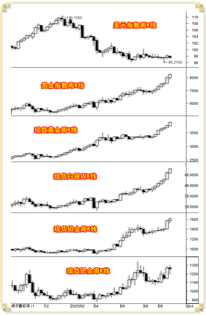 九月国际现货金价以3447.84美元开盘,最高上试3871.39美元,最低下探3636.39美元,报收3857.92美元,上涨410.40美元,涨幅11.90%,振幅12.62%,月K线以光头光脚长阳线的极强态势再创历史新高,创14年最大月度涨幅。2011年8月,金价创12.24%的月度涨幅之后,大周期见顶于1920.80美元。截止10月6日收盘,年内上涨50.93%。 ![]() 九月美元指数以97.83点开盘,最高上试98.63点,最低下探96.21点,报收97.82点,下跌20点,跌幅0.02%,振幅2.48%,月K线呈窄幅震荡十字阴。截止10月6日收盘,年内大幅下跌9.56%。 九月wellxin贵金指数(金银钯铂)以7102.21点开盘,最高上试8224.78点,最低下探7058.72点,报收8115.05点,上涨1014.43点,涨幅14.29%,振幅16.42%,月K线呈震荡上行长阳线,再创历史收高。截止10月6日收盘,年内上涨58.60%。 九月: 银价上涨17.57%,振幅19.40%,报收46.64美元,截止10月6日收盘,年内上涨67.83%; 铂金价上涨15.22%,振幅20.39%,报收1572.66美元,截止10月6日收盘,年内上涨79.73%; 钯金价上涨12.98%,振幅18.60%,报收1252.75美元,截止10月6日收盘,年内上涨45.33%; ![]() 九月伦敦铜铝铅锌镍锡六大基本金属全线上涨: 伦铜上涨3.94%,振幅3.63%,报收10296.00美元,截止10月6日收盘,年内上涨21.31%; 伦铝上涨2.60%,振幅5.04%,报收2687.00美元,截止10月6日收盘,年内上涨6.41%; 伦铅下跌0.55%,振幅2.40%,报收1986.00美元,截止10月6日收盘,年内上涨2.66%; 伦锌上涨5.06%,振幅6.82%,报收2956.50美元,截止10月6日收盘,年内下跌0.52%; 伦镍下跌0.91%,振幅3.12%,报收15265.00美元,截止10月6日收盘,年内上涨1.05%; 伦锡上涨1.29%,振幅5.35%,报收35400.00,截止10月6日收盘,年内上涨26.73%; NYMEX原油价格下跌2.47%,振幅7.76%,报收62.43美元,截止10月6日收盘,年内下跌14.12%。 道琼斯指数上涨1.87%,振幅3.88%,报收46397.89点,截止10月6日收盘,年内上涨9.76%。 纳斯达克指数上涨5.61%,振幅8.24%,报收22660.01点,截止10月6日收盘,年内上涨18.80%。 标准普尔指数上涨3.53%,振幅5.25%,报收6688.46点,截止10月6日收盘,年内上涨14.60%。 综合对比观察,在美元指数熊市氛围中,无论九月,还是年内,贵金属(金银铂钯)市场表现可谓光辉灿烂。但原油与基本金属并没借弱势美元起舞,若美元后市破位下行,商品市场可能起舞“补涨”,就像2025年银钯铂相较于2024年黄金强势的补涨逻辑一样。 截止10月6日(周一)收市,贵金指数(金银铂钯)年内涨幅高达58.6%,远超基本金属中表现最强的铜、锡。 虽今年金银等贵金属市场牛气冲天,但对于经验不足的纯技术派而言,这样的大牛市很不好把握,甚至容易参考以往经验做反行情,导致大幅亏损。因为,金价大周期在技术层面上已非常超买,技术分析师很容易经验性测顶做空。如国际现货金价月K线通用信息图示: ![]() 小图2,金价月线布林指标信息显示,目前金价强势运行在布林中枢线与第一上轨之间,紧贴第一上轨,属于超强运行状态。但距离第二上轨有一定差距,还不到类似今年4月测试第二上轨压力那般强势过度。盲目技术性做空,仍有遭遇继续逼空的可能。 小图3,金价月线MACD趋势信息图,目前趋势之强,已远超2011年金价见顶1920.80美元前的牛市大周期。在趋势如此强悍的同时,也会引诱技术分析师揣测金价趋势见顶,进而可能不断尝试做空。 小图4,金价月线KD指标信息,最新K值高达93.10,创下1979年10月以来的约46年最高值。对于经验不足的技术分析师而言,无疑构成很大战略做空诱惑,甚至可能不惜狠狠搏上一把,博这就是中期顶部。回顾1979年9月,当金价月线KD指标之K值定格于96.41点,对应金价收盘于397.30美元时,岂不更应该技术性战略做空黄金?!但此后三个月,金价在KD指标背离回落过程中,巨幅上涨至850美元。若在1979年9月参考金价KD极度超买值盲目做空,结果将是毁灭性的。毫无疑问,KD指标在极端行情中完全失效了! 小图5,金价月线RSI指标,最新数据高达96.29点,创下自1973年7月以来的50多年最高值,大周期比KD指标更超买。1973年6月,金价月线RSI指标定格97.19点,金价对应收盘于123.30美元,此后金价调整约5个月,最大调整幅度超25%,金价下探90美元。但至1975年1月,金价大幅上涨至195.30美元,即金价调整数月之后再度翻倍上涨。不难发现,技术性揣度金价中期见顶,虽有可能,但战略逢低做多才应该是金市操作主旋律。 小图6,金价月线CR能量指标,最新数据为382.836点,创下了自1982年3月以来的40多年新高! 再如截止上周(10月3日)的贵金属、美元周K线信息图示: ![]() 国际现货金价以3757.52美元开盘,最高上试3896.49美元,最低下探3756.97美元,报收3885.90美元,上涨126.50美元,涨幅3.36%,振幅3.71%,周K线震荡上行长阳线,续创历史新高。 美元指数以98.14点开盘,最高上试98.17点,最低下探97.44点,报收97.70点,下跌460点,跌幅0.47%,振幅0.74%,周K线呈震荡回落小阴线。 wellxin贵金指数(金银钯铂)以8001.44点开盘,最高上试8818.86点,最低下探7901.89点,报收8239.17点,上涨241.53点,涨幅3.02%,振幅5.21%,周K线中长阳上行,续创历史新高。 现货银价上涨4.13%,振幅5.61%,报收47.94美元,续创14年新高。 现货铂金价格上涨2.34%,振幅6.68%,报收1604.85美元; 现货钯金价格下跌0.93%,振幅8.22%,报收1256.00美元; 再如截止上周(10月3日)的NYMEX原油、LME基本金属周K线信息图示: ![]() NYMEX原油价格下跌6.90%,振幅7.67%,报收60.69美元; 伦铜上涨4.85%,振幅5.41%,报收10700.00美元; 伦铝上涨2.00%,振幅2.45%,报收2702.00美元; 伦铅上涨0.72%,振幅2.60%,报收2016.00美元; 伦锌上涨4.99%,振幅5.39%,报收3030.50美元; 伦镍上涨1.75